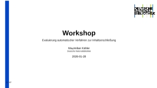 14:00 Uhr bis 16:30 Uhr | Maximilian Kähler • Deutsche Nationalbibliothek Workshop Evaluierung automatischer Verfahren zur InhaltserschließungÜberblick | |