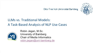 | 16:00 Uhr | Robin Jegan • Lehrstuhl für Medieninformatik • Wirtschaftsinformatik und Angewandte Informatik • Universität Bamberg LLMs vs. traditionelle Methoden: Eine fallbasierte Analyse von NLP-SzenarienAbstract | |