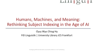| 09:30 Uhr | Clara Wan Ching Ho, M.Sc. • Computerlinguistik • FID Linguistik • Universitätsbibliothek Johann Christian Senckenberg Frankfurt Humans, Machines, and Meaning: Rethinking Subject Indexing in the Age of AIAbstract | |